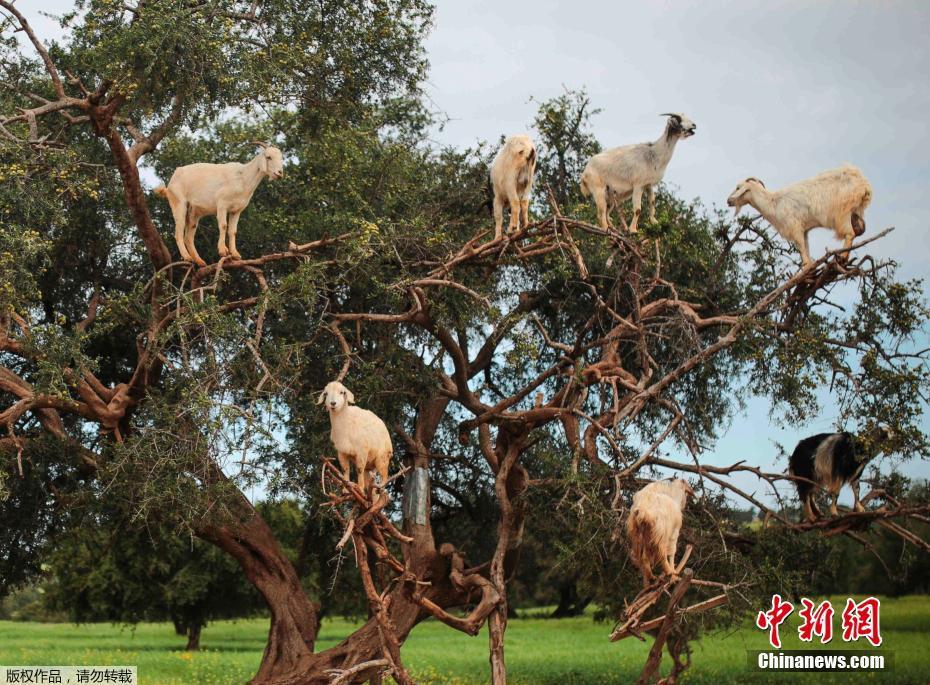 当地时间4月4日,在摩洛哥索维拉,几只山羊爬到阿甘树上,觅食摩洛哥坚果。据了解,这种奇特的场景只有在摩洛哥才能经常看到,由于山羊无法完全消化果实的果核,所以粪便中会留下果实的果核,而农民会搜集这些果核,榨取油用于烹饪和化妆品。