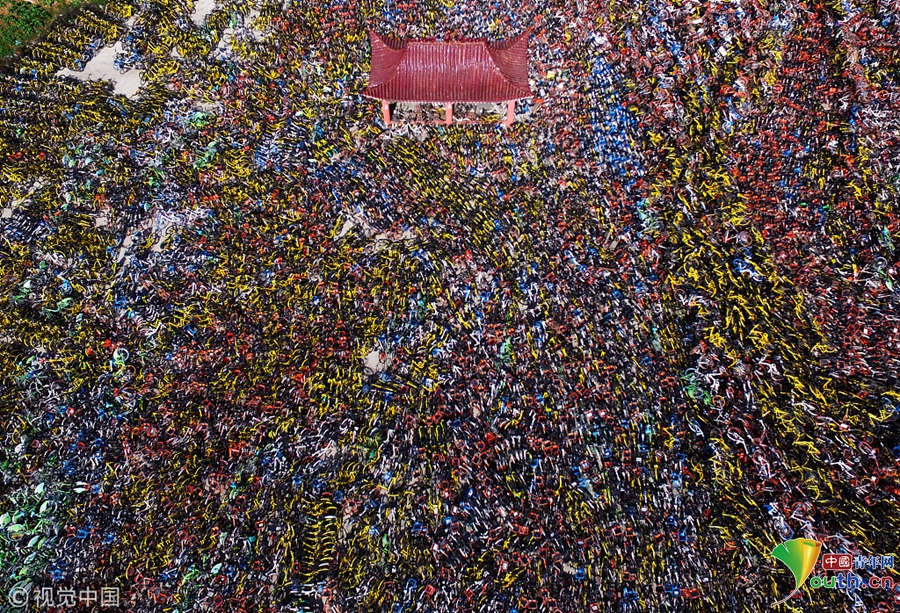 2018年4月7日,武汉,空地上堆满了万辆共享单车。