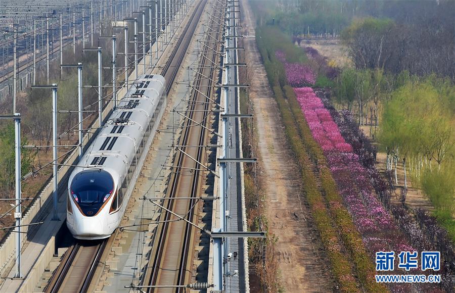 4月9日,一列由天津站开往北京南的复兴号动车组列车行驶在天津市区。 新华社发(杨宝森摄)