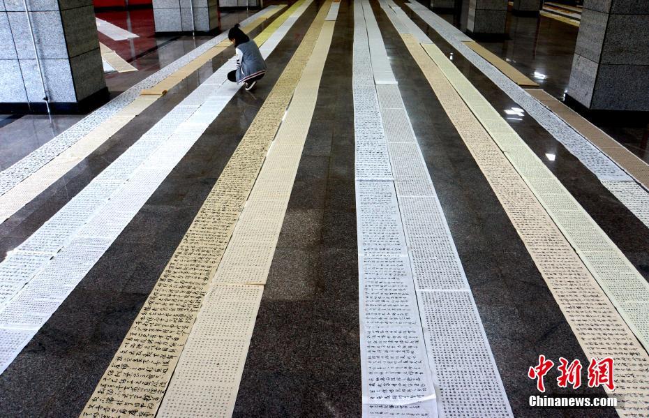 4月9日,咸阳师范学院于右任书法学院学生们的寒假作业铺满了教学楼大厅,在寒假一个月中,该院大一至大四的学生必须交够两万字左右的书法作业,有的学生用小楷将《道德经》抄写了四遍,写“秃”了5只毛笔。该校此举旨在让书法变成学生的一种习惯和生活方式,在笔耕不辍中追寻书法艺术的本源。中新社记者 张远 摄
