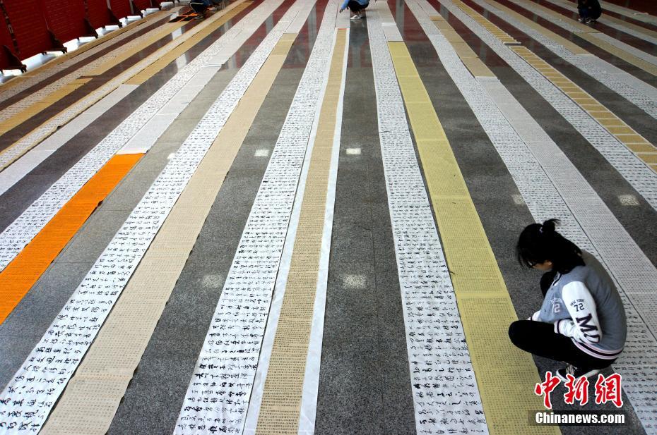 4月9日,咸阳师范学院于右任书法学院学生们的寒假作业铺满了教学楼大厅,在寒假一个月中,该院大一至大四的学生必须交够两万字左右的书法作业,有的学生用小楷将《道德经》抄写了四遍,写“秃”了5只毛笔。该校此举旨在让书法变成学生的一种习惯和生活方式,在笔耕不辍中追寻书法艺术的本源。中新社记者 张远 摄