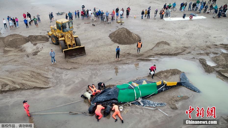 民众合力救助这条搁浅的鲸鱼。他们在沙滩上挖坑,将鲸鱼推进去,还用湿布盖住鲸鱼身体,持续泼水,保持鲸鱼体表湿润。