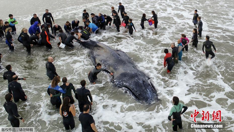 对于鲸鱼这样的大型动物,一旦搁浅,失去了海水浮力的庞大身躯在陆地上的重力作用下,对骨骼和内脏产生极大的压力。加上干燥的空气和暴晒,搁浅鲸鱼往往会很快死亡。图为民众想办法保持搁浅鲸鱼体表湿润。
