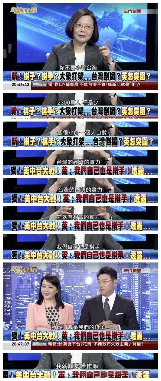 环环10日报道了一件奇闻——蔡英文上电视访谈,回应“台湾是美国棋子”,居然敢说“你不要忘了,我们自己也是棋手,所以川普是我们的棋子”。☞要是我就忍不了!特朗普,蔡英文说你是她“棋子”!