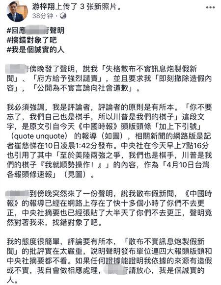 台湾“总统府”(即省长办公室——环环注)10日晚突然发布声明,矛头直指游梓翔“造假”,批评他曾经做过地方政府发言人,却“失格散布不实讯息,炮制假新闻”。同时点名批评《中国时报》《联合报》两家蓝营媒体“未经查证,径自引用不实讯息,做成错假新闻”,要求游本人与两家媒体公开道歉。