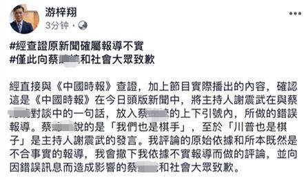 他突然在脸书发布致歉声明,宣称经与《中国时报》查证,以及节目实际播出的内容,确认《中国时报》在报道中,将主持人谢震武的一句话,放入蔡英文引语的信号内。也就是说,蔡英文只说了“台湾也是棋手”,那句“所以川普是我们的棋子”是男主持人接话茬说的,不是蔡英文原话。↓