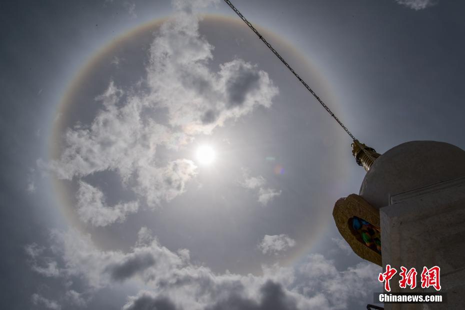 4月11日,拉萨上空出现日晕奇观。日晕是一种大气光学现象,是日光通过卷层云时,受到冰晶的折射或反射而形成的。 中新社记者 何蓬磊 摄