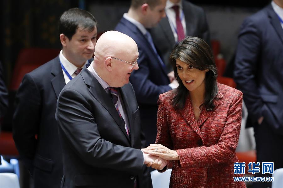 4月10日,在位于纽约的联合国总部,俄罗斯常驻联合国代表涅边贾(前左)同美国常驻联合国代表黑莉(前右)在安理会叙利亚化武问题会议前握手。联合国安理会10日就美国和俄罗斯分别起草的3份涉及叙利亚化武袭击调查机制的决议草案进行表决,3份草案均未获通过。新华社记者 李木子 摄
