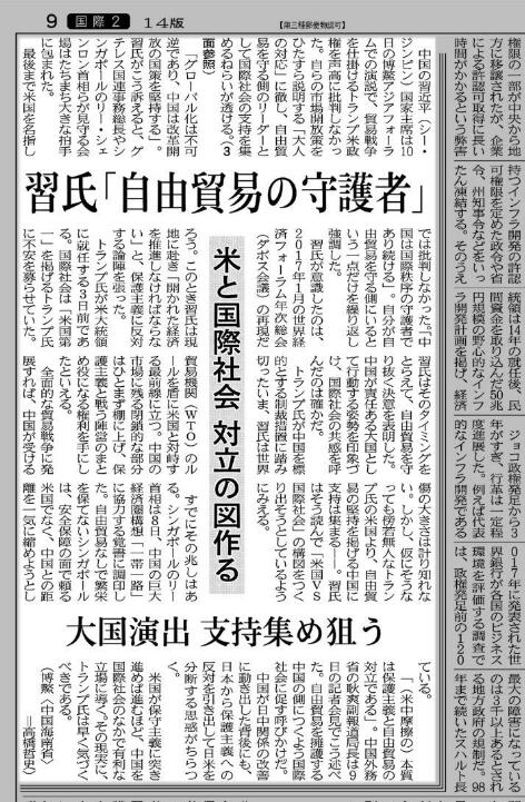 直到演讲最后,中国也没有点名批评美国,而是站在维护自由贸易的一边,强调“中国始终是世界和平的建设者、全球发展的贡献者、国际秩序的维护者”。《日本经济新闻》评论称,现在特朗普把中国当成靶子,执意要采取制裁措施,比起旁若无人的特朗普,肯定是坚持自由贸易的中国赢得支持。