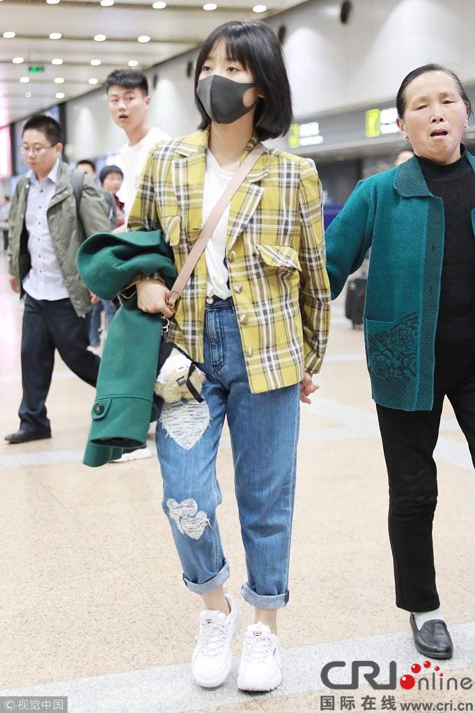 沈月现身北京机场。身穿黄色格纹外套和爱心破洞牛仔九分裤,少女感爆棚。沈月一路牵着奶奶的手,走路小心翼翼,果然是一个超级乖乖女。