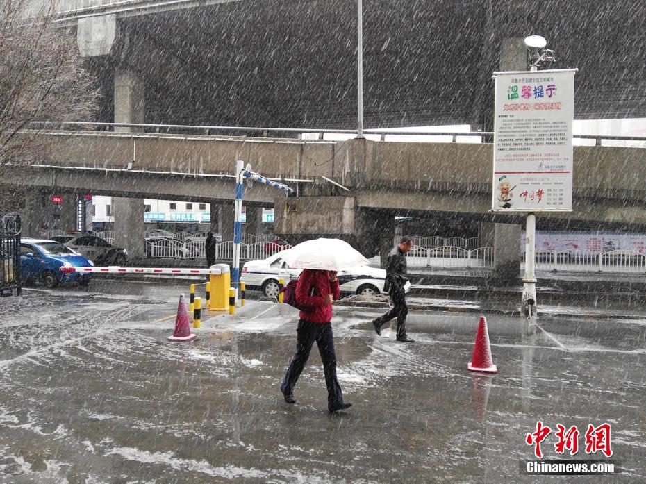 受冷空气影响,4月11日中午时分,乌鲁木齐市开始下起小雪,截至目前降雪仍在持续,气温也随之下降至零度左右。为躲避寒冷,街上行人打起雨伞脚步匆匆,一些行驶车辆打开车灯缓慢通行。新疆气象台16时许发布天气预报称,乌鲁木齐今天夜间小雪转多云,明天白天晴间多云,最高气温7℃,最低气温-1℃。戚亚平 摄