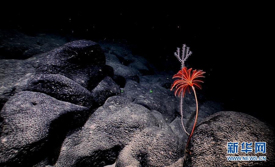 麦哲伦海山的海星(4月9日摄)。深海大洋中的海山又被称为“海底花园”。近日,中国“科学”号科考船上的“发现”号深海机器人多次探访西太平洋的麦哲伦海山,并“现场直播”了壮美“山景”。新华社记者 张建松 摄