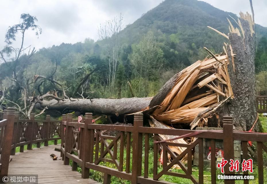 2018年4月12日消息,陕西汉中,4月4日夜,当地狂风骤雨,电闪雷鸣,天气异常,夫妻古树被大风刮到。又恰逢清明时节,当地百姓为之惋惜。 文字来源:华商报 图片来源:视觉中国