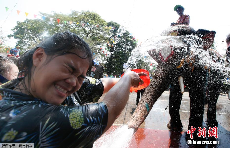 泰国民众迎接宋干节 人象泼水大战激烈开演