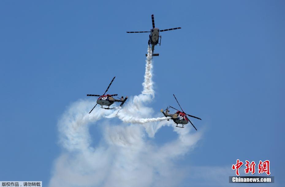 当地时间4月11日,印度国际防务展在印度金奈举行。图为印度空军直升机飞行表演队现场进行空中表演。