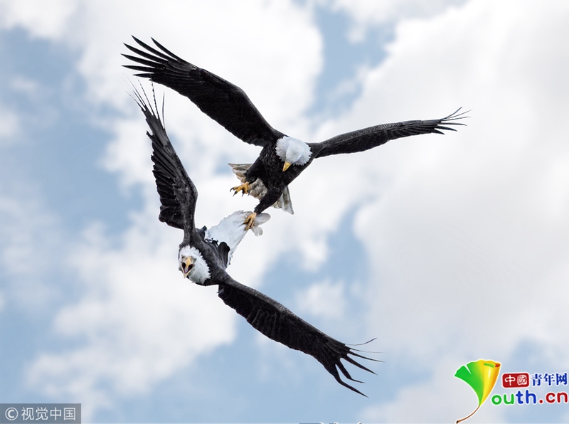 美国马里兰州科纳温戈大坝,两只美国秃鹰在空中争斗。其中一只正向地面俯冲,另一只紧抓它的尾巴穷追不舍,试图抢夺它刚捕获的鱼。 (具体拍摄时间不详),图片作者:Solent News/视觉中国