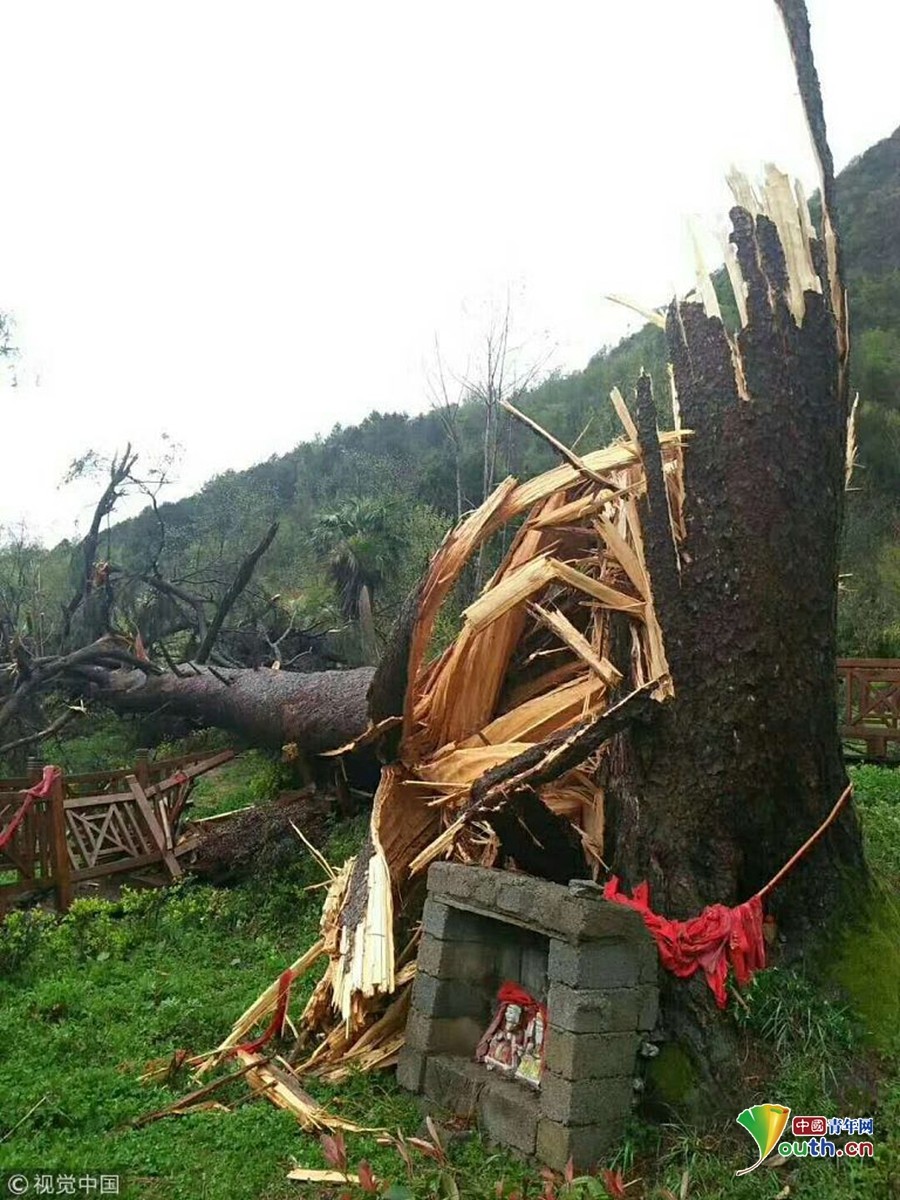 2018年4月4日夜,陕西汉中,当地狂风骤雨,电闪雷鸣,天气异常,夫妻古树被大风刮到。又恰逢清明时节,当地百姓为之惋惜。