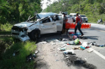 4月12日,泰国董里府(Trang),一辆皮卡与一辆轿车发生碰撞,事故造成16人受伤。(图片来源:《曼谷邮报》)