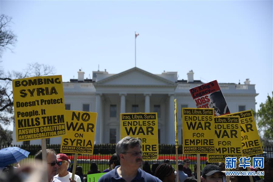 新华社照片,华盛顿,2018年4月14日 (国际)(1)美国民众集会抗议对叙利亚进行军事打击 4月14日,在美国华盛顿白宫北侧,人们手持标语抗议对叙利亚进行军事打击。美国总统特朗普美东时间13日晚下令美军联合英国、法国对叙利亚军事设施进行“精准打击”,以作为对日前叙东古塔地区发生“化学武器袭击”的回应。新华社记者杨承霖摄