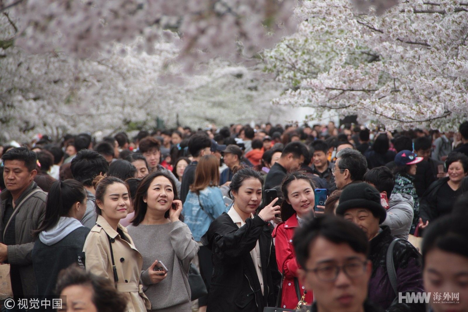 2018年4月14日,青岛中山公园里的樱花大道已成为花的海洋,由于当天正值周末,现场吸引了近10万名游客前来赏樱。短短700米的樱花大道寸步难行,远远望去现场人山人海,甚是壮观。(来源:视觉中国)