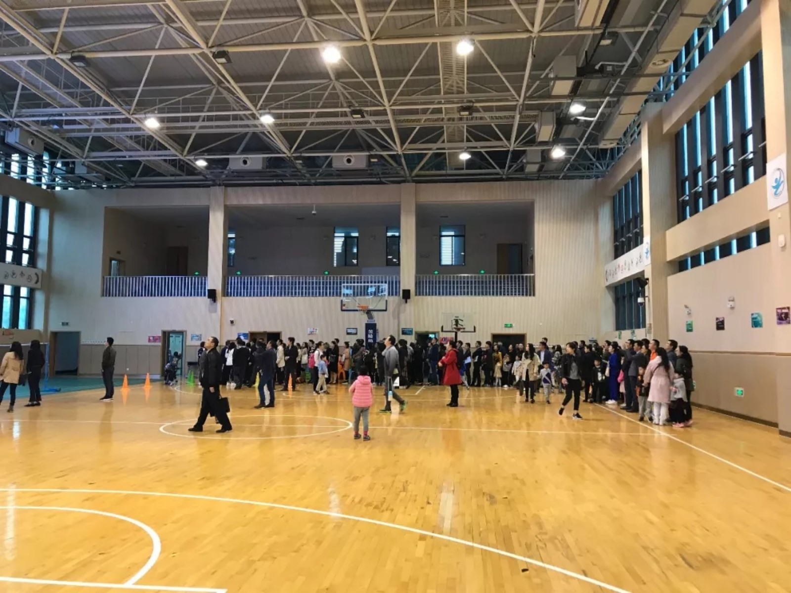 篮球场里,已经游园的家长在这里排队。