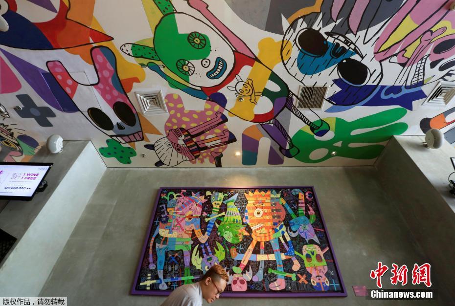 印度尼西亚雅加达的一家酒店主打艺术风格,一名工人在清理餐厅的桌子,旁边是印度尼西亚艺术家埃迪·哈拉的一幅画。