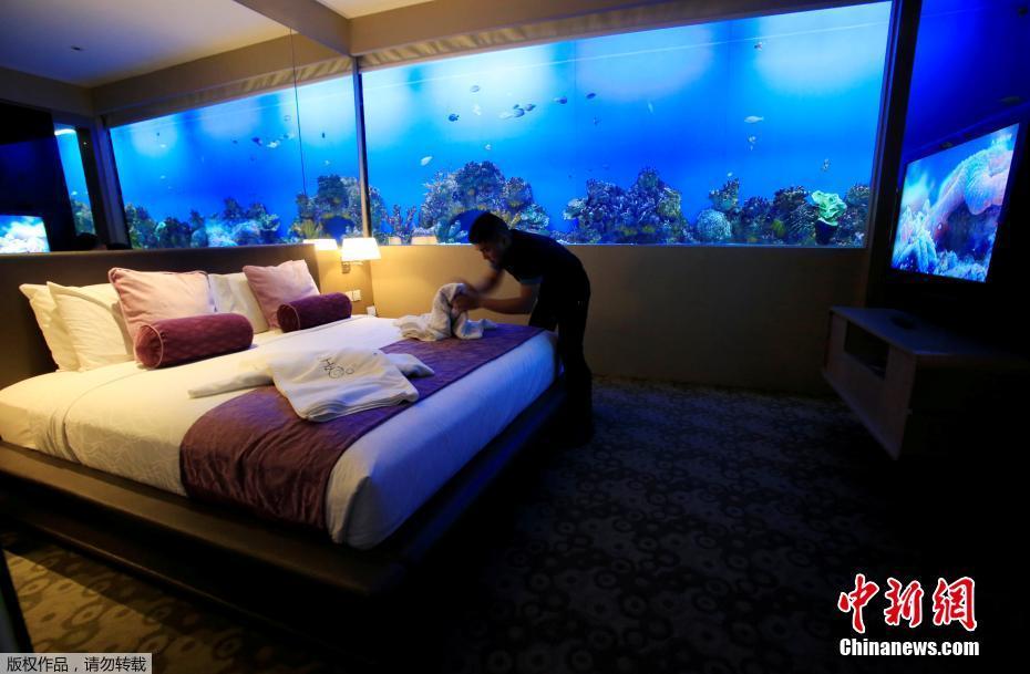 菲律宾首都马尼拉,一名员工在H2O酒店内收拾房间,整套房间被营造出睡在海底的效果,不仅有鱼缸墙,连电视和灯光都与环境配套。