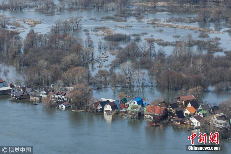 当地时间2018年4月15日,俄罗斯沃罗涅日州,当地一村落遭洪水侵袭,村庄变水乡。 图片来源:视觉中国
