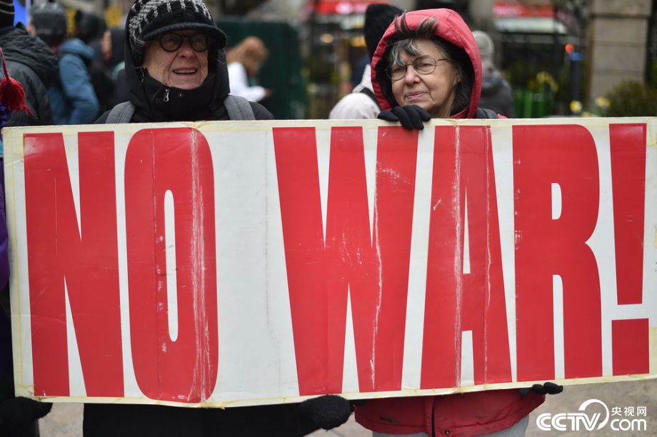 当地时间2018年4月15日,美国纽约,民众举行反战游行,抗议美英法联军袭击叙利亚。 视觉中国 美国民众举行反战游行 抗议美英法联军袭击叙利亚