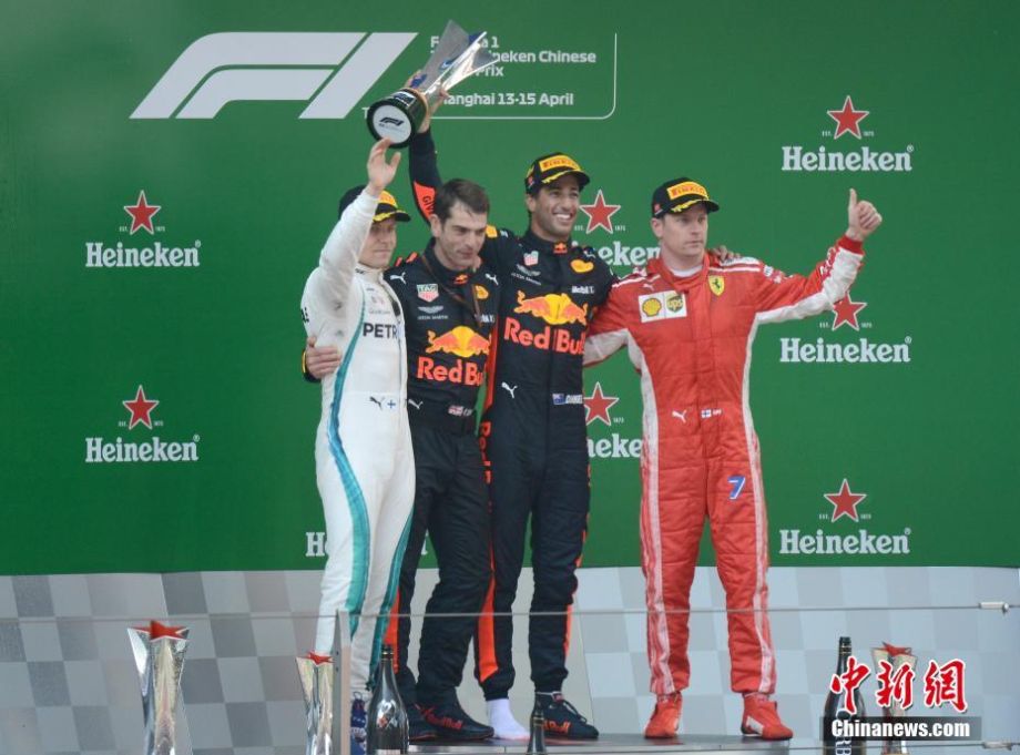 F1上海站 里卡多用赛车鞋喝香槟庆祝胜利