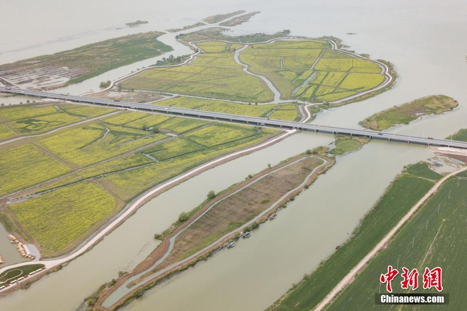 4月16日,航拍江苏高邮湖郊野公园内盛开的油菜花,田间“高邮”二字和盂城古驿站、明清南门、唐镇国寺塔等当地历史文化古迹等图案格外醒目。高邮地处长江三角洲的江苏省中部、里下河西缘,土地肥沃,物产丰富,素有“鱼米之乡”之称。 中新社记者 泱波 摄