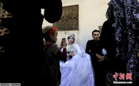 2017年10月27日,叙利亚拉卡,“叙利亚民主军”从恐怖组织“伊斯兰国”手中全面解放东部城市拉卡后,该地区第一对新人婚礼举行,当地民众们参加婚礼载歌载舞,为新人们庆祝。