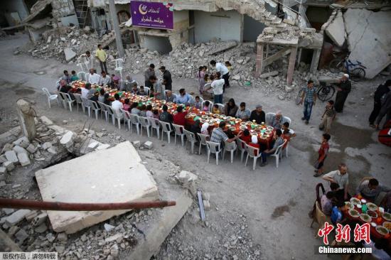 当地时间2017年6月18日,临近穆斯林斋月结束,在叙利亚大马士革郊区叛军控制的杜马镇,当地居民在战场废墟中摆开长桌,享受盛宴。食物主要包含一些传统食品、甜食和饮料等,由慈善组织捐赠。这是当地最好的食物了,也这是孩子们的节日。由于当地没有电力,天黑之后人们就很难看见食物了。