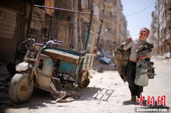 当地时间4月16日,遭到轰炸后的第二天,大马士革的生活一如往常,一个男孩抱着防弹背心走在破败的马路上。