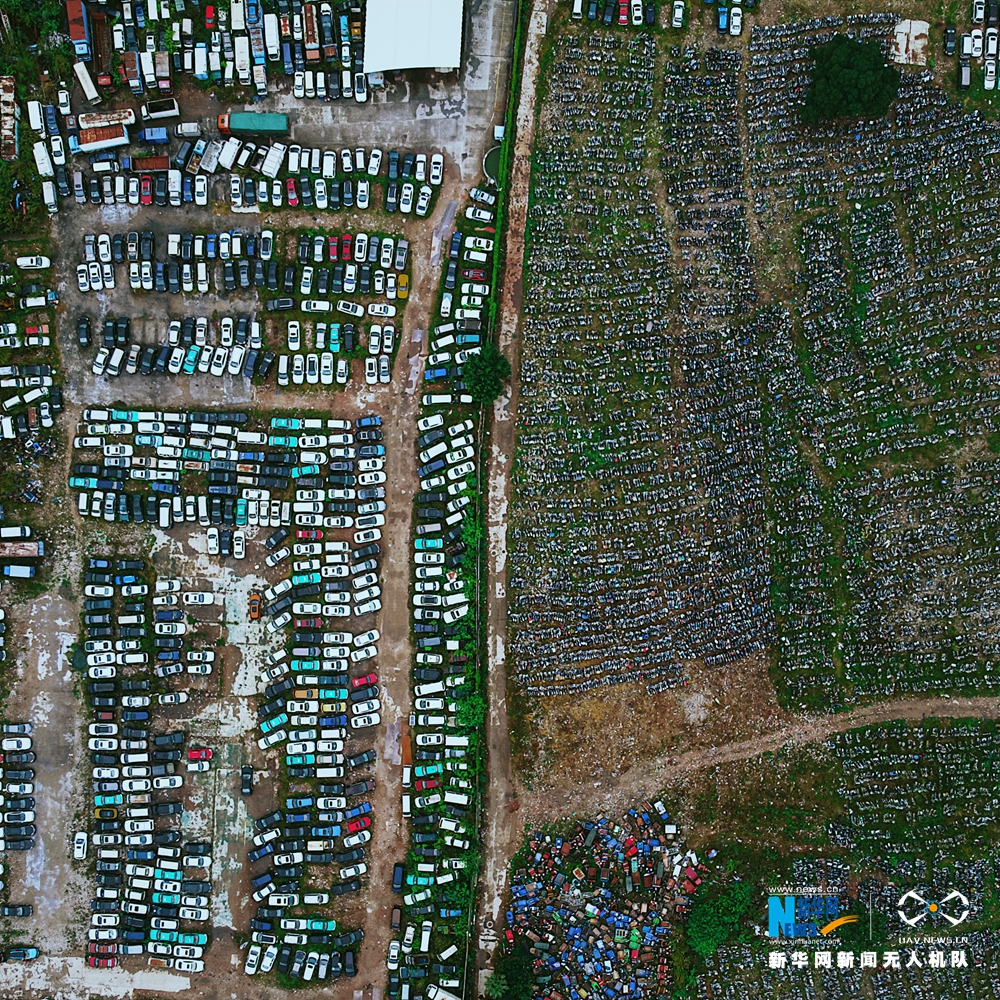 这里是广州的一个废弃车辆停放场,这里有许多“服役”多年已经“退休”的老车,也有很多违规的残车。它们很可能是儿时那辆搭乘过的木头座椅公交车,可能是在小学门口卖臭豆腐的三轮车,也可能是曾经每天五块钱把上班快要迟到的你载到地铁站的那辆摩托车,这里还有面目全非的烂铁,更有被车主当成创意画布的违规改装跑车......航拍摄影师用无人机记录下广州这片“废墟”,他说,这里的车或许有事故,但一定有故事。新华网发 叶冠锐摄
