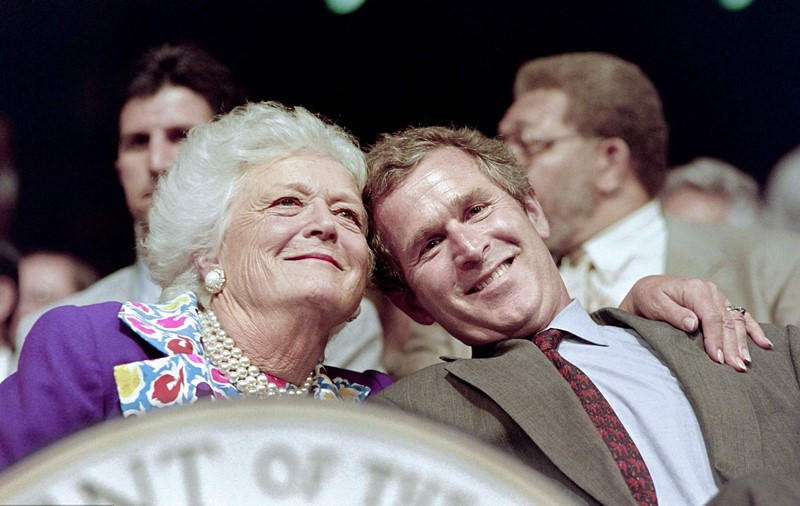 当地时间1992年8月17日,美国休斯敦, 前美国第一夫人芭芭拉.布什与儿子乔治·布什出席共和党全国代表大会。