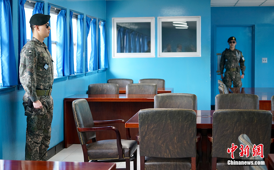 4月18日,韩国组织部分外国记者探访板门店韩方一侧的和平之家、自由之家及位于京畿道都罗山的南北出入境管理所。4月27日南北首脑会晤临近,板门店安保也更加严格。图为板门店韩方一侧自由之家T2会谈室。中新社记者 吴旭 摄
