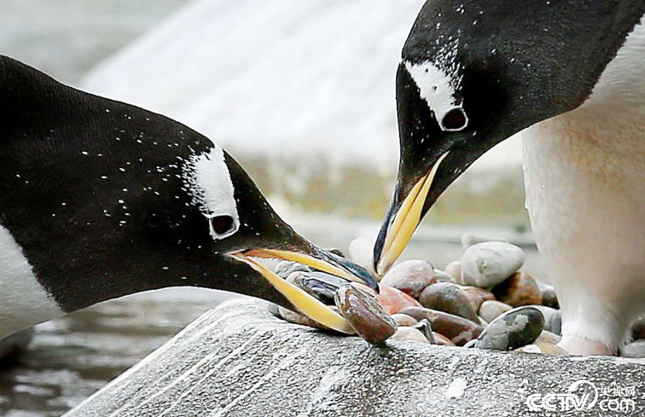 英国动物园雄企鹅比拼“捡石头”求偶