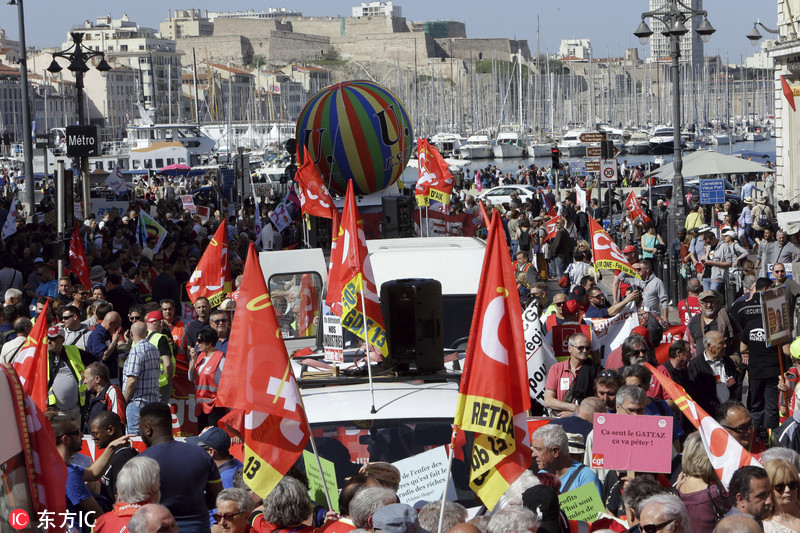 当地时间2018年4月19日,法国各地持续爆发抗议活动,学生罢课“占领”校园,铁路工人罢工游行,反对总统马克龙的改革计划。