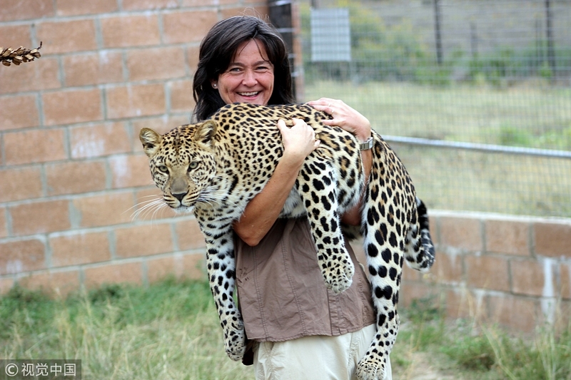 2018年4月19日讯,南非柯克伍德,50岁的芭贝特( Babette De Jonge)是一个自然资源保护论者,2010年她创立了一个保护区( Wild Cats World)来保护濒危的大型猫科动物。2012年保护区开始接收动物,至今这里有了4只成年豹和一只幼崽,还有薮猫、狞猫和非洲最小的猫--黑足猫。芭贝特与这些获救的豹子相处融洽,尽力帮助它们康复。Barcroft Media/视觉中国