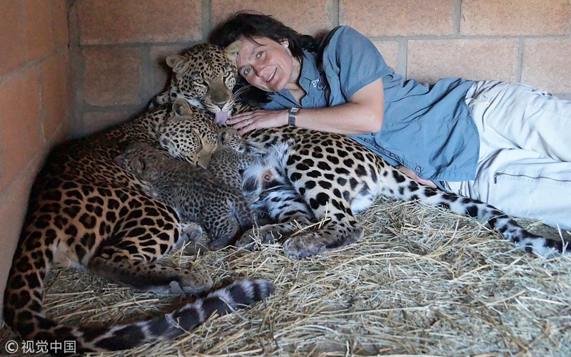 2018年4月19日讯,南非柯克伍德,50岁的芭贝特( Babette De Jonge)是一个自然资源保护论者,2010年她创立了一个保护区( Wild Cats World)来保护濒危的大型猫科动物。2012年保护区开始接收动物,至今这里有了4只成年豹和一只幼崽,还有薮猫、狞猫和非洲最小的猫--黑足猫。芭贝特与这些获救的豹子相处融洽,尽力帮助它们康复。Barcroft Media/视觉中国
