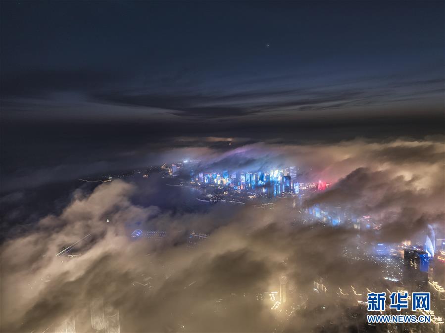 4月20日晚,无人机拍摄的青岛五四广场上空平流雾美景。 新华社发(卢晖 摄)