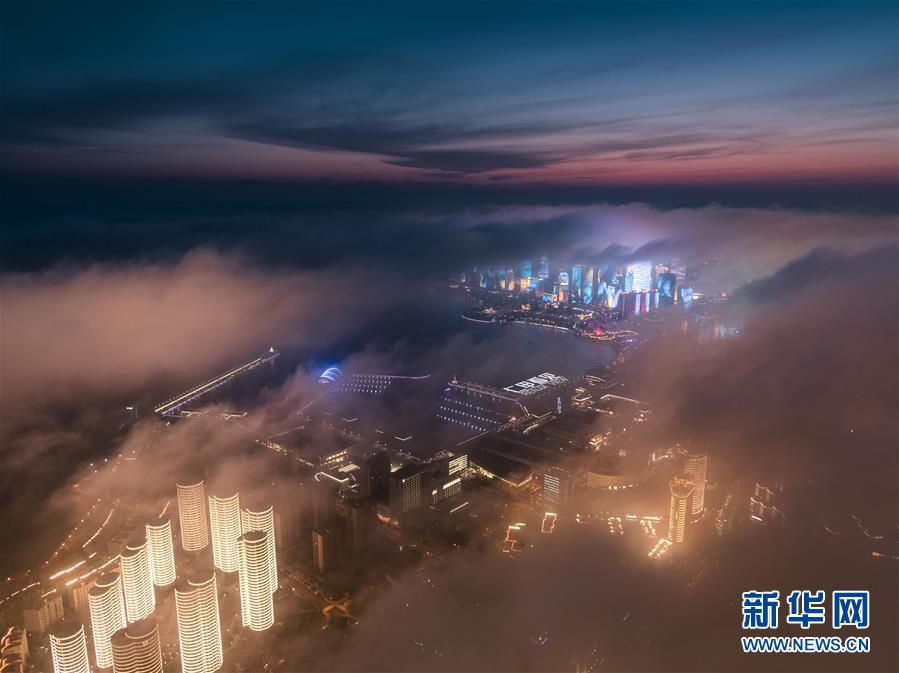 4月20日晚,无人机拍摄的青岛五四广场上空平流雾美景。当日晚,青岛五四广场毗邻的浮山湾出现平流雾,萦绕在夜晚建筑物间的雾气营造出流光溢彩的景观。 新华社发(卢晖 摄)
