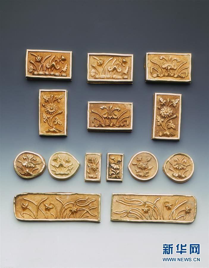 这是英国巴斯东亚艺术博物馆公布的被盗文物明代成套十四件黄金带銙的照片。 新华社发