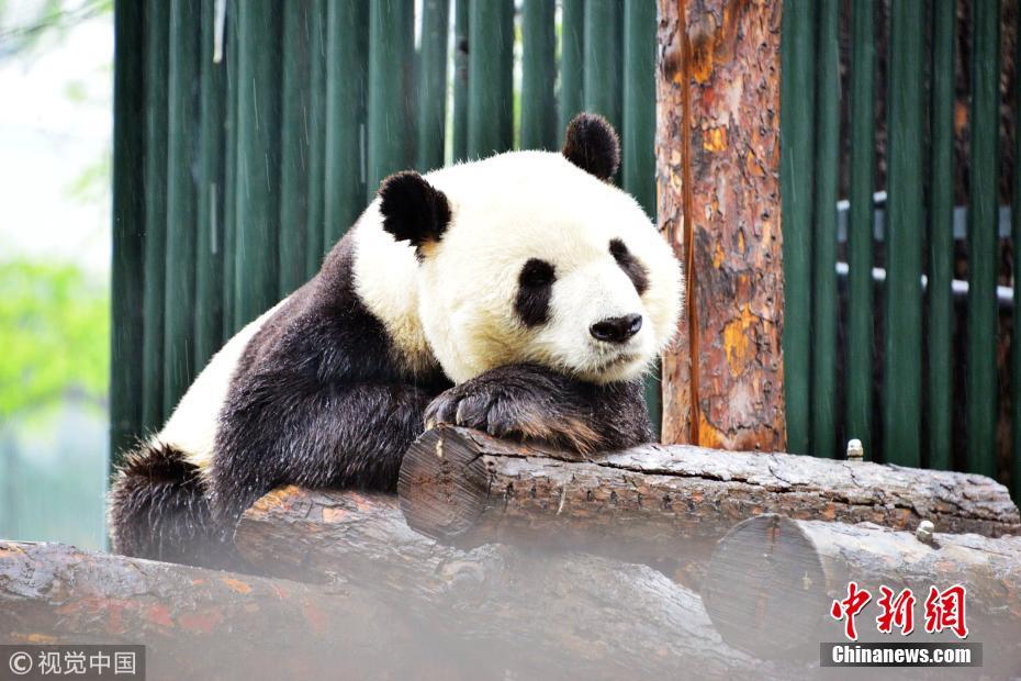北京降雨又降温 大熊猫蒙双眼雨中萌萌酣睡