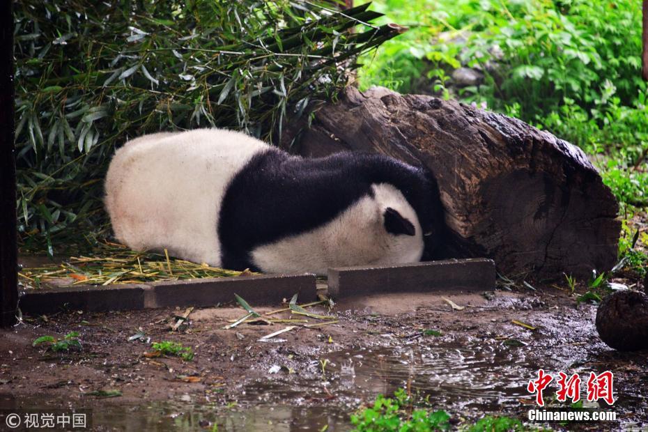 北京降雨又降温 大熊猫蒙双眼雨中萌萌酣睡