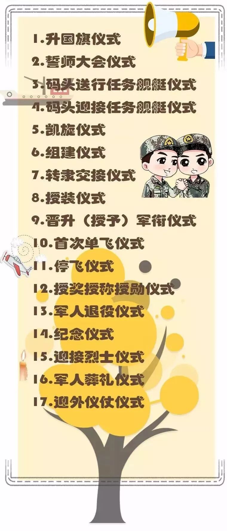 仪式是队列生活的重要内容,是军队正规化的重要体现。新一代共同条令集中对升国旗、誓师大会、码头送行任务舰艇、码头迎接任务舰艇、凯旋、组建、转隶交接、授装、晋升(授予)军衔、首次单飞、停飞、授奖授称授勋、军人退役、纪念、迎接烈士、军人葬礼、迎外仪仗等17种主要仪式进行了规范。