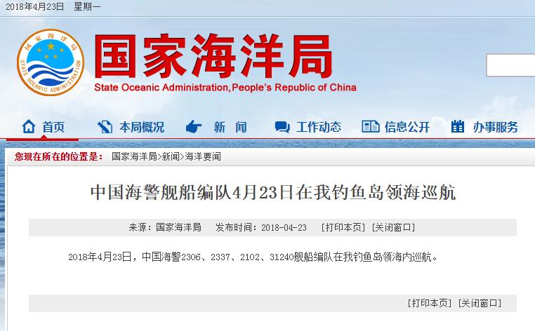 国家海洋局网站消息,2018年4月23日,中国海警2306、2337、2102、31240舰船编队在我钓鱼岛领海内巡航。