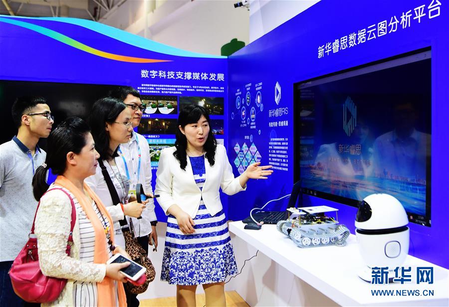 4月22日,在首届数字中国建设成果展览会上,新华网股份有限公司工作人员为观众介绍新华睿思数据云图分析平台。当日,在福州举行的首届数字中国建设成果展览会向公众开放,吸引众多观众前来了解、体验最新数字科技。该展览会设有数字福建、电子政务、数字经济、数字社会体验4个展馆,总面积超过4万平方米,共有293个参展单位。新华社记者 魏培全 摄