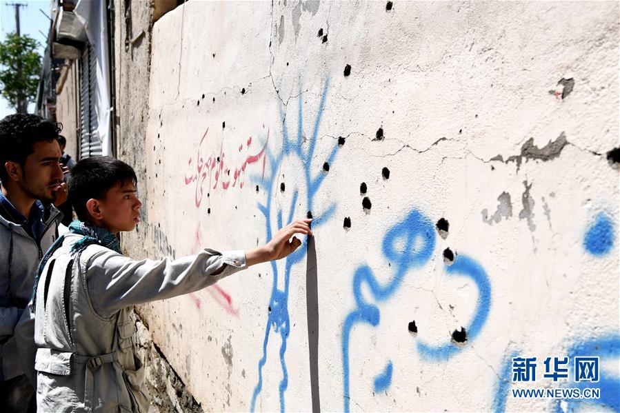 4月22日,在阿富汗首都喀布尔,市民在爆炸现场查看被毁坏的墙壁。新华社记者 代贺 摄